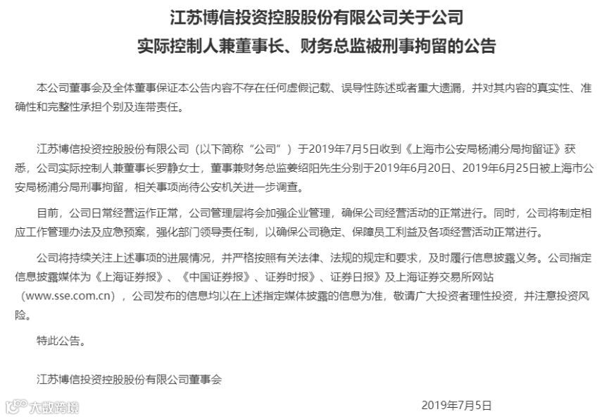 7月5日午间,博信股份公告称,江苏博信投资控股股份有限公司于2019年7月5日收到《上海市公安局杨浦分局拘留证》获悉,公司实际控制人兼董事长罗静女士,董事兼财务总监姜绍阳先生分别于2019年6月20日、2019年6月25日被上海市公安局杨浦分局刑事拘留,相关事项尚待公安机关进一步调查。