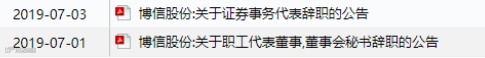 就在近日,博信股份董秘陈苑、证代张泽双双辞职。从公告来看,董秘、证代辞职正是在公司两位高管出事之后。据博信股份披露,董秘陈苑是在6月30日提交的辞职报告。