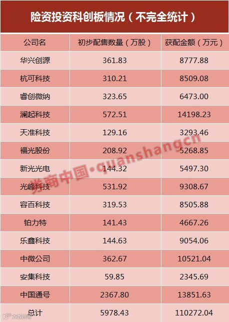 券商中国记者统计显示,中国人寿、中华联合保险集团、中华联合人寿、中华联合财险、新华保险、恒安标准人寿、百年人寿、国华人寿、前海人寿、吉祥人寿、幸福人寿、上海人寿、国联人寿、和泰人寿、平安养老、太平养老、长江养老、人保养老、亚太财险、紫金财险、国寿资产、平安资产、太平洋资产、泰康资产、太平资产、新华资产、中再资产、华泰资产、阳光资产、安邦资产、中意资产、光大永明资产、华夏久盈资产、民生通惠资产、华安财保资产等30多家保险公司及资管公司参与了科创板“打新”。