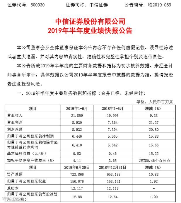 12日晚间,中信证券披露了2019年上半年业绩预告,合并口径营收218.59亿元,归母净利润64.46亿元。二者同比增幅分别为9.33%以及15.83%。