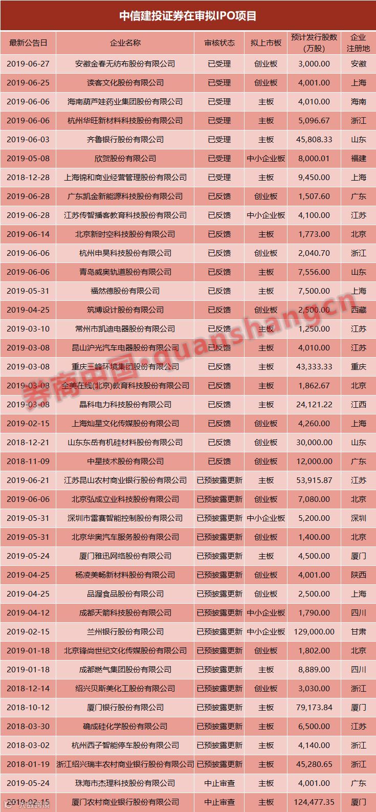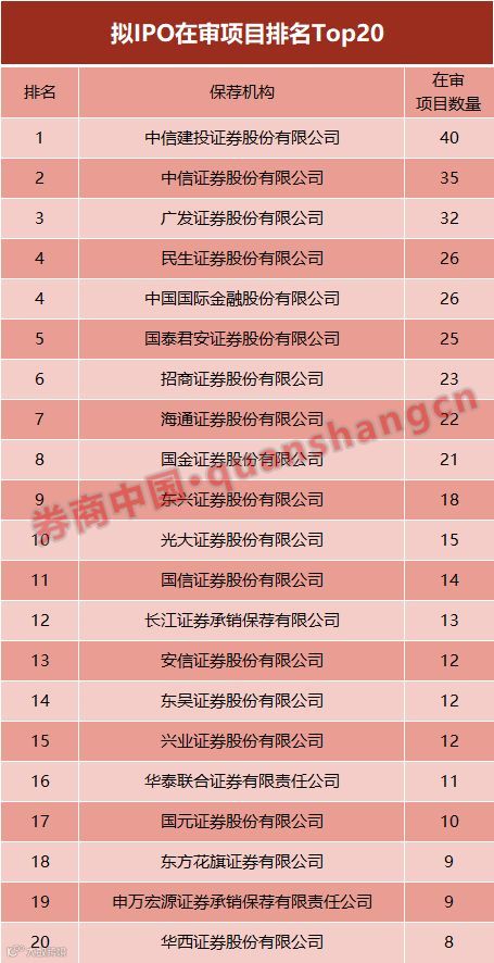 券商中国记者统计,中信建投证券有40家在审核当中的拟IPO项目,在所有保荐机构中,在审项目数量排名第一。