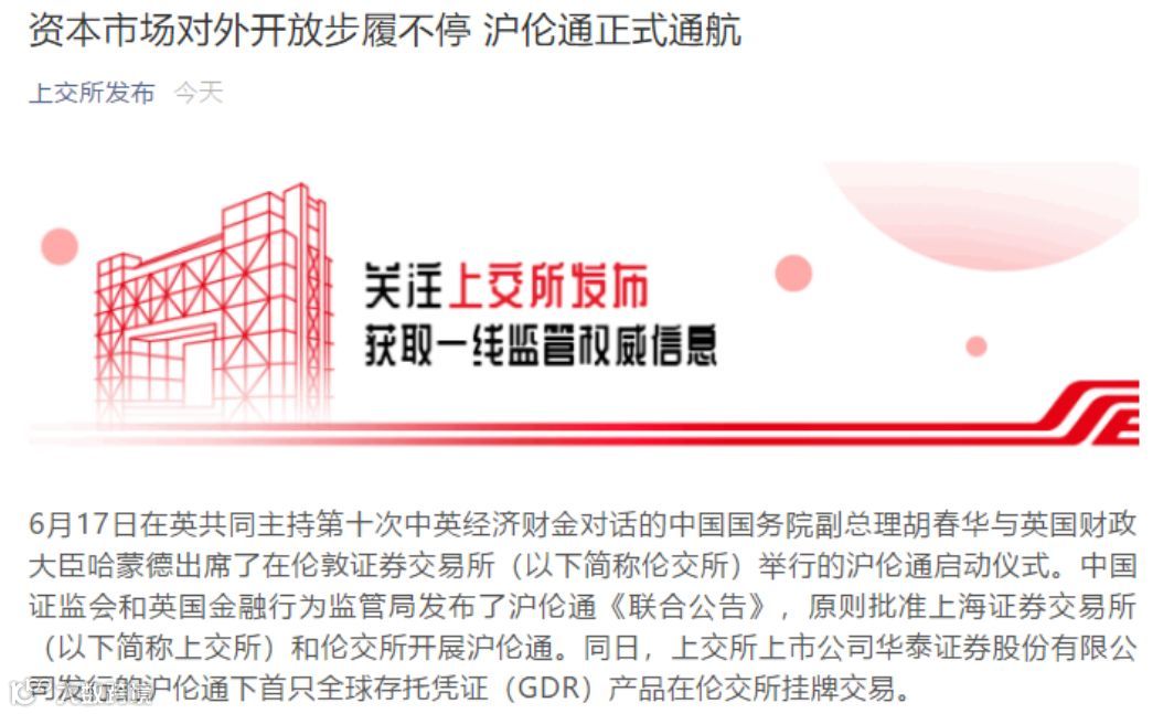 同日,上交所上市公司华泰证券股份有限公司发行的沪伦通下首只全球存托凭证(GDR)产品在伦交所挂牌交易,首家“A+H+G”公司诞生。