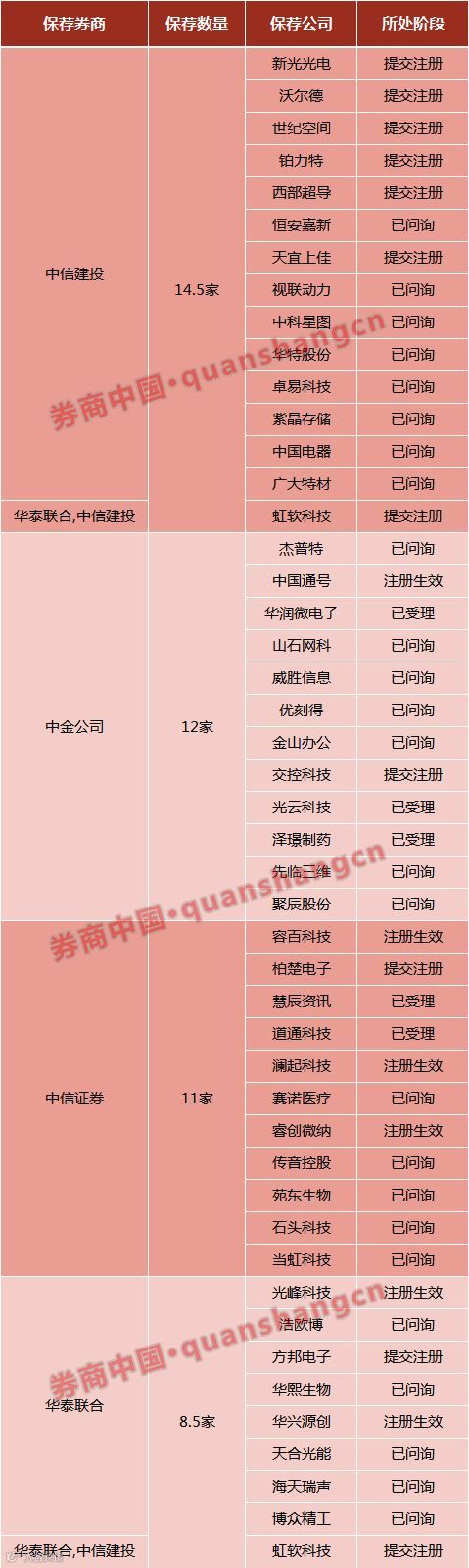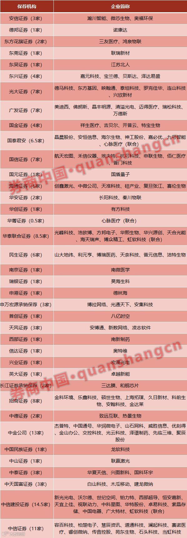 此外,中金公司、招商证券、兴业证券、国信证券、申万宏源证券承销保荐五家券商保荐项目均占一席。