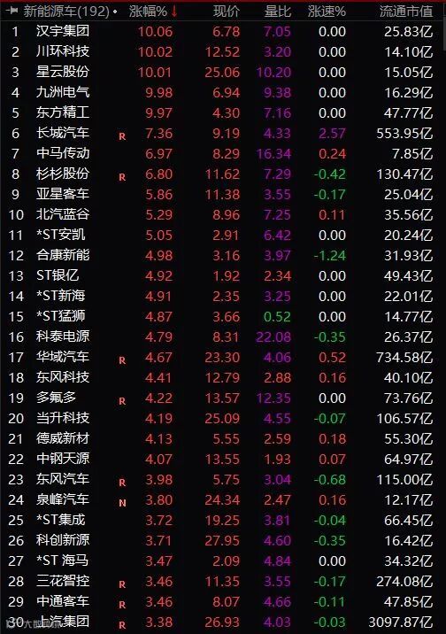 受上述消息影响,A股市场新能源汽车板块集体异动,板块指数迅速翻红,并呈现直线拉升,盘中涨幅一度超过2%。早盘多达14只股票触及涨停,截至券商中国发稿,汉宇集团、川环科技、星云股份、九洲电气、东方精工等涨停,中马传动、亚星客车、北汽蓝谷、杉杉股份等涨逾5%。
