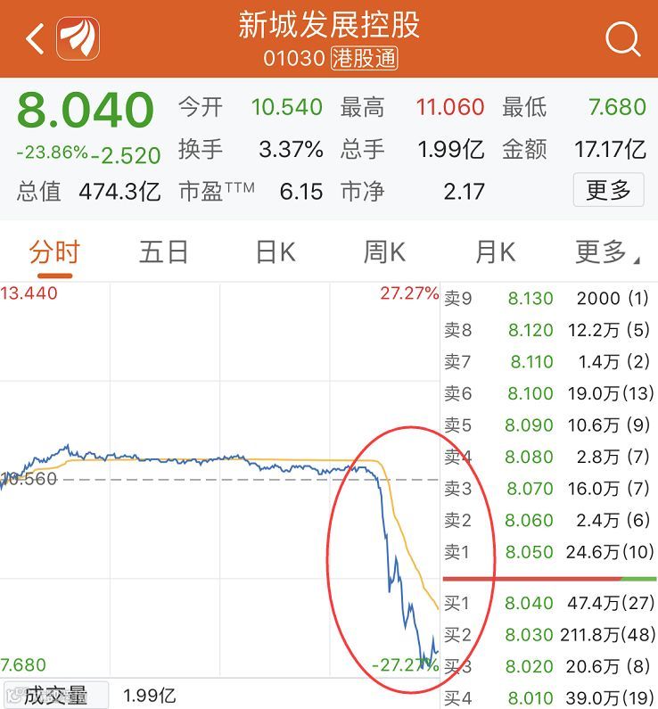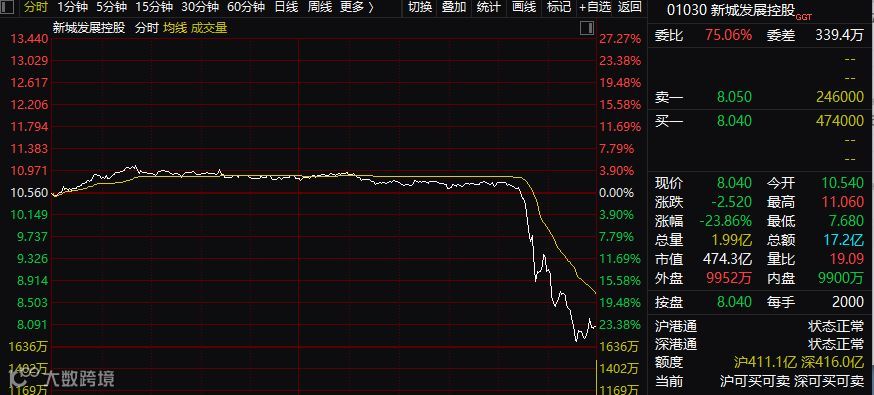 港股新城发展控股则表现非常激烈,该股收盘杀跌23.86%,最多时曾跌幅超过26%。