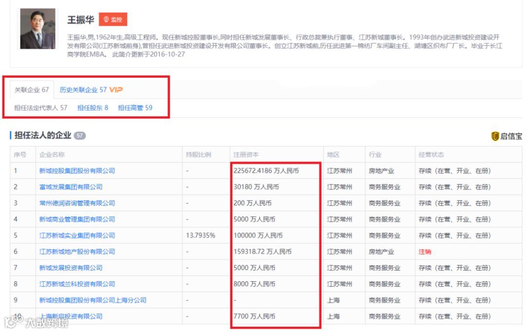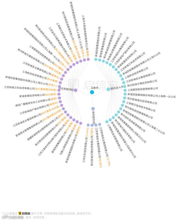 在他担任法定代表人的57家企业中,有26家显示为“注销”状态,在存续的企业中,以房地产、投资、商业管理企业为主,包括新城控股集团股份有限公司、江苏新城地产股份有限公司、江苏新城实业集团有限公司等,此外,还投资有广播电视业、软件信息业企业,如上海星轶影院管理有限公司、上海橙贝信息技术有限公司,累计注册资本超过50个亿。