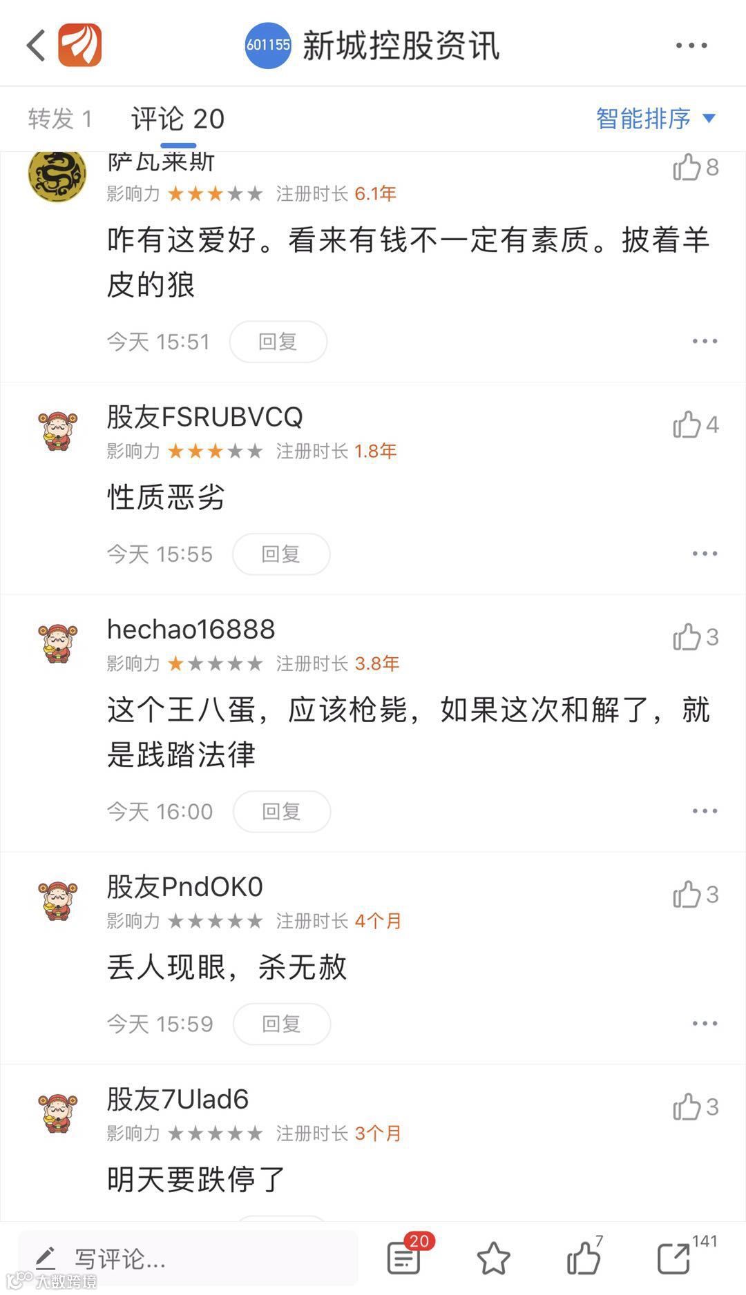 如此天理难容的消息曝光之后,港股新城发展控股迅速杀跌,跌幅最多超过26%。而在此消息曝光之前,A股上市公司新城控股已经收盘,不过从该股股吧的留言情况来看,王某和该公司已经被众人唾骂。新城控股前十大流通股东中,多数为机构持仓,因此该股亦可能遭遇基金下调估值的情况。