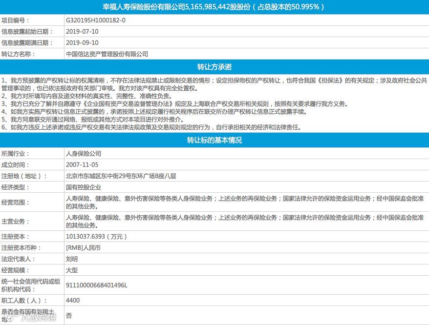 7月10日,上海产交所预披露转让项目:中国信达拟公开转让所持幸福人寿的全部股权,即约51.66亿股股份,对应股权比例50.995%。