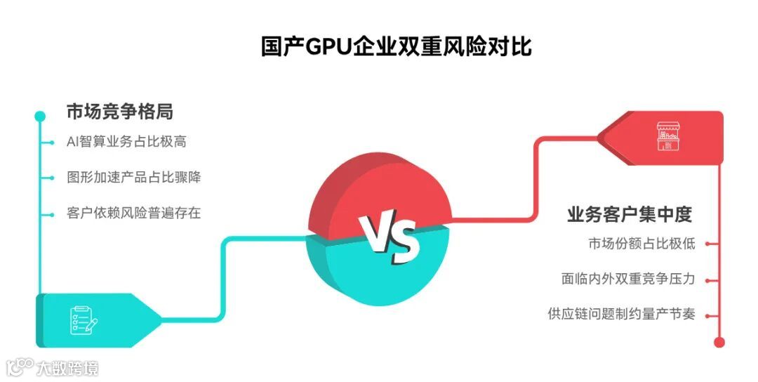 AI 智算业务占比超 94%,而图形加速产品收入占比从 2024 年的 22.06% 骤降至 2025 年上半年的 4.68%,且消费级显卡持续亏损,产品结构单一问题显著。尽管未披露客户集中度数据,但参考行业竞品沐曦股份前五大客户占比曾达 91.58% 的情况,国产 GPU 企业普遍面临客户依赖风险,需警惕核心客户采购波动对研发投入回收的影响。