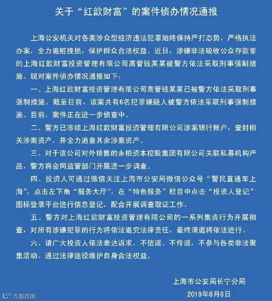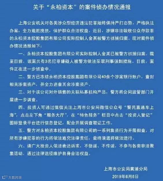6月6日,上海市公安局黄埔分局及长宁分局相继发布警情通报,称涉嫌非法吸收公众存款罪的永柏资本实际控制人金某已被警方抓捕归案,永柏旗下公司红歆财富高管钱某某也已被警方采取刑事强制措施。目前,案件正在进一步侦查中。