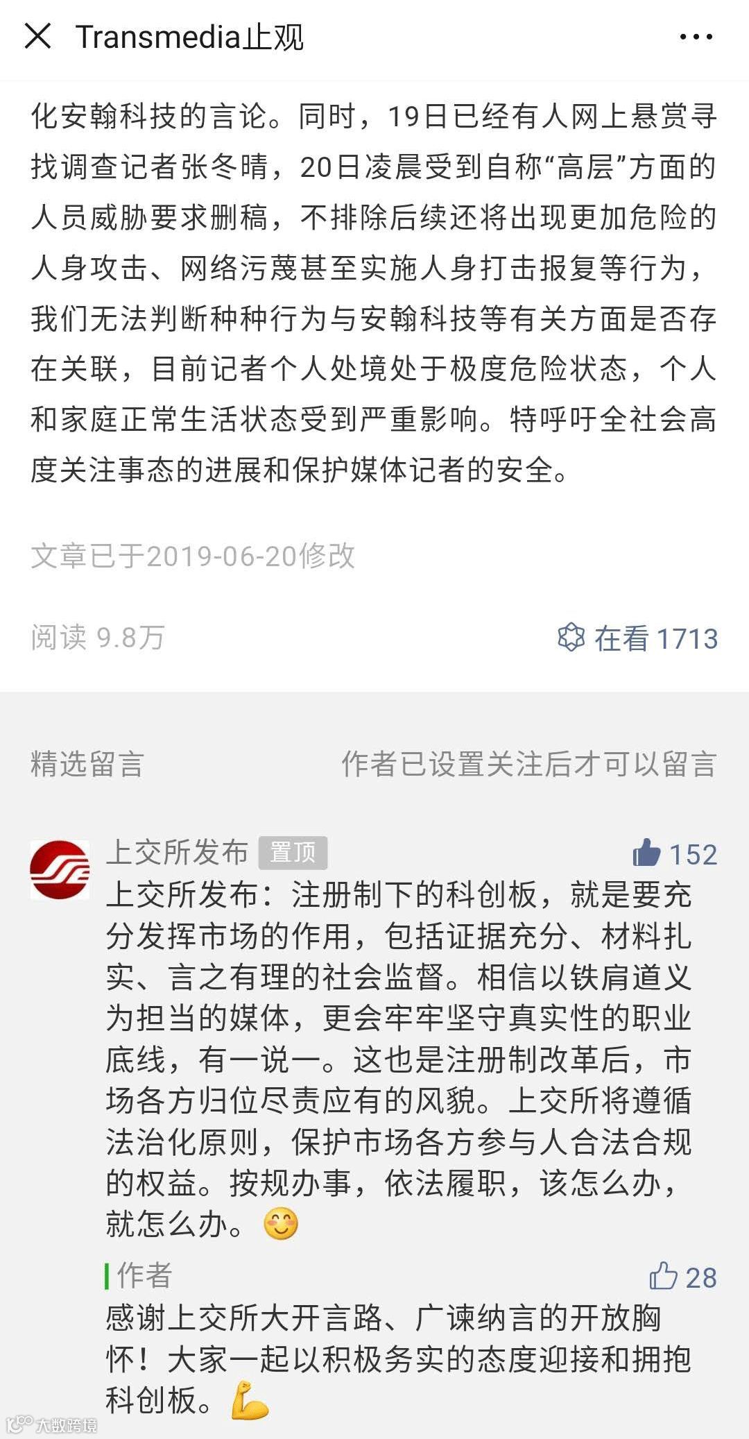 值得一提的是,自媒体“Transmedia止观”微信号上,6月20日发布了“安翰科技的谎言”调查记者张冬晴向上交所等有关各方的情况汇报”一文,对于这篇质疑报道,上交所给出开放、欢迎的态度,上交所留言称: