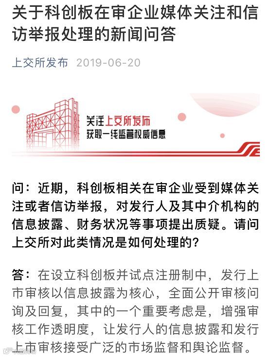 针对此类情况,上交所明确,在设立科创板并试点注册制中,发行上市审核以信息披露为核心,全面公开审核问询及回复,其中的一个重要考虑是,增强审核工作透明度,让发行人的信息披露和发行上市审核接受广泛的市场监督和舆论监督。