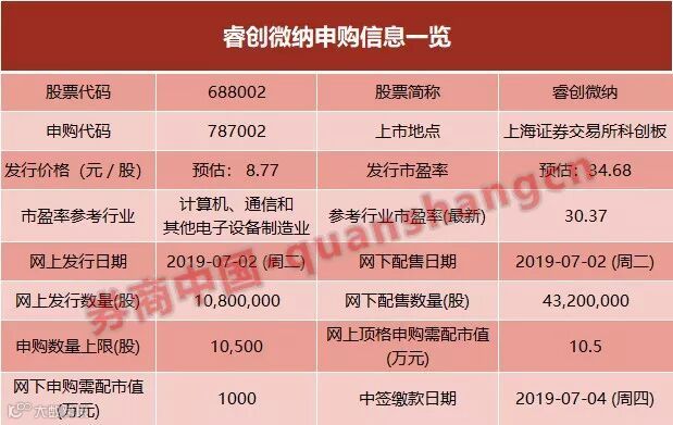 睿创微纳发布公告称,申购代码为787002,申购日期为下周二(7月2日),网上申购数量上限为10500股,顶格申购需要沪市市值10.5万元,中签缴款日为7月4日(下周四)。