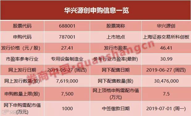具体来看,华兴源创申购代码为787001,申购日期为本周四(6月27日),网上发行数量为761.9万股,网下配售数量为3047.6万股。其中,网上申购数量上限为7500股,顶格申购需要沪市市值7.5万元,中签缴款日为7月1日(下周一)。