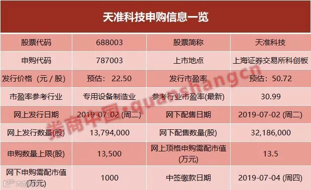 天准科技股票代码为688003,申购代码为787003,申购日期为下周二(7月2日),网上申购数量上限为13500股,顶格申购需要沪市市值13.5万元,中签缴款日为7月4日(下周四)。