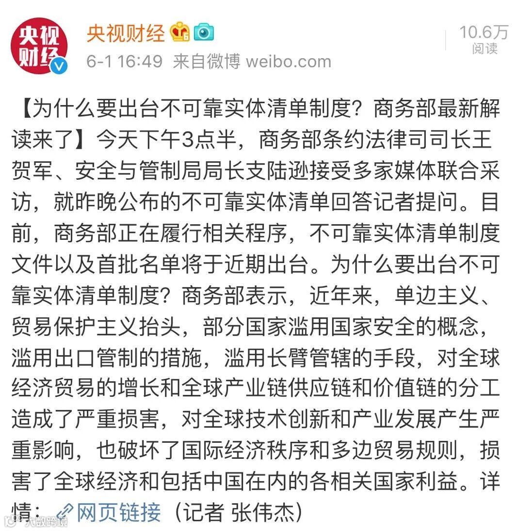 此外,针对为什么要出台“不可靠实体清单”制度、哪些行为会被列入“不可靠实体清单”、对列入“不可靠实体清单”的主体将采取哪些措施等问题,6月1日商务部也做了详解。