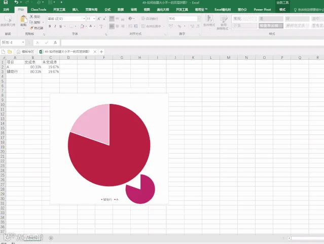 第四步:设置辅助行饼图分离16%,然后分别选取辅助行的完成和未完成合并,如图1-4;