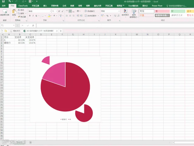 第三步:饼图颜色设置。A项目的未完成率设置无填充,完成部分为色值:186,33,105;辅助行,未完成部分色值:242,181,210,如图1-3;