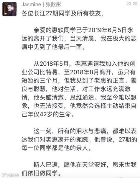 张歆彤在悼念惠轶的朋友圈中写道:“从2018年5月,老惠邀请我加入他的创业公司比特易,至2018年8月离开,虽只有短暂3个月时间,但我见到了老惠的正直、善良与聪慧,他对生活、对工作永远充满激情,他头脑清澈、思维通透。”