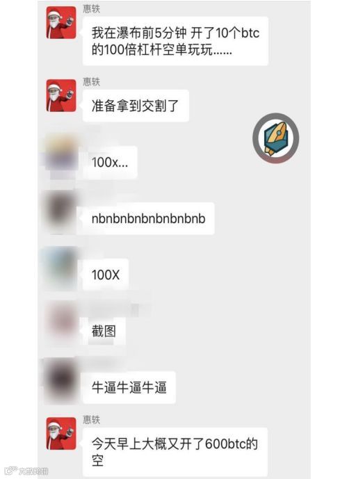 如果满仓开10倍杠杠的BTC看涨合约,当BTC下跌10%,用户将会爆仓。而惠轶使用了100倍杠杠开空,假如满仓操作,当BTC价格上涨1%,账户内资金将会损失殆尽。