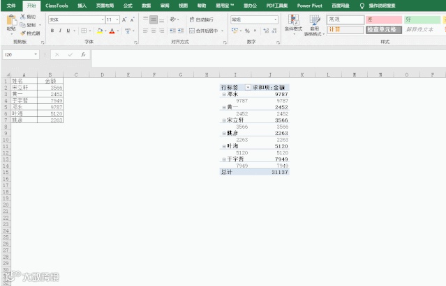 第一步:创建数据模型,选择数据源,插入数据透视表,插入在现有工作表中的I2单元格,创建数据透视表,拖动姓名和金额在列区域,再拖动金额到值区域,如图1-1;