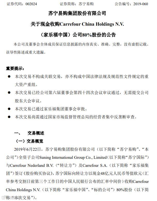 公告显示,6月22日,苏宁易购全资子公司苏宁国际与Carrefour Nederland B.V。及Carrefour S.A。签订《股份购买协议》,苏宁国际向Carrefour Nederland B.V。以现金48亿元人民币等值欧元(汇率参考交割日前第三个工作日的中国人民银行公布的汇率中间价)收购家乐福中国80%股份。同时,苏宁易购将对家乐福中国提供股东贷款,用于运营资金方面提供支持,具体金额视交割日家乐福中国公司净负债、运营资金的情况确定。