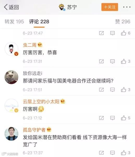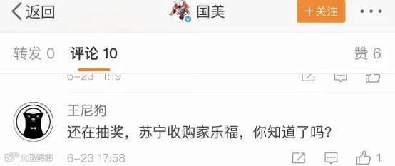 在苏宁易购收购家乐福中国的公告发布之后,有网友火速在国美官微下留言:还在抽奖呢,苏宁收购家乐福,你知道了吗?