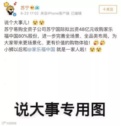 6月23日傍晚,苏宁易购突然发布告称,公司全资子公司苏宁国际拟出资48亿元人民币等值欧元收购家乐福中国80%股份。本次交易完成后,苏宁易购将成为家乐福中国控股股东,家乐福集团持股比例降至20%。