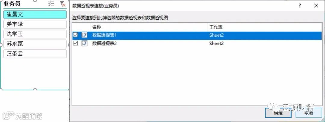 第二步:插入切片器-业务员字段,报表链接表1和表2;如图1-2;
