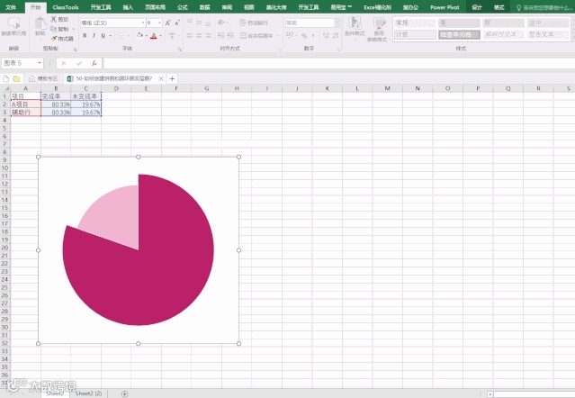第三步:饼图颜色设置。A项目的未完成率设置无填充,完成部分为色值:186,33,105;辅助行,未完成部分色值:242,181,210,如图1-3;