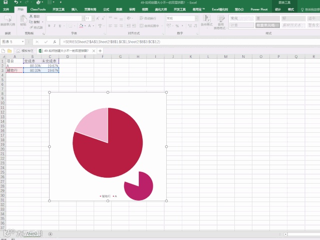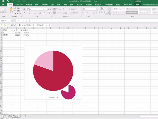 第四步:设置辅助行饼图分离16%,然后分别选取辅助行的完成和未完成合并,如图1-4;