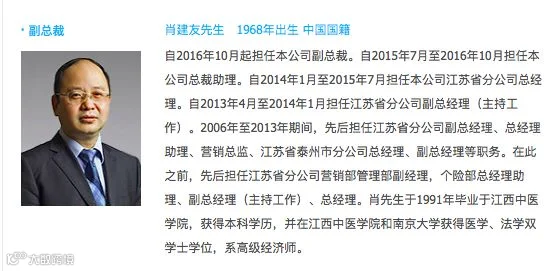 中国人寿披露的信息显示,肖建友1968年出生,2015年7月进入公司高管层,先是总裁助理,2016年10月升任副总裁。之前,他是国寿江苏省分公司的总经理,2006年到2014年为江苏省分的管理层成员,是从江苏分公司一线摸爬滚打成长起来的高管。