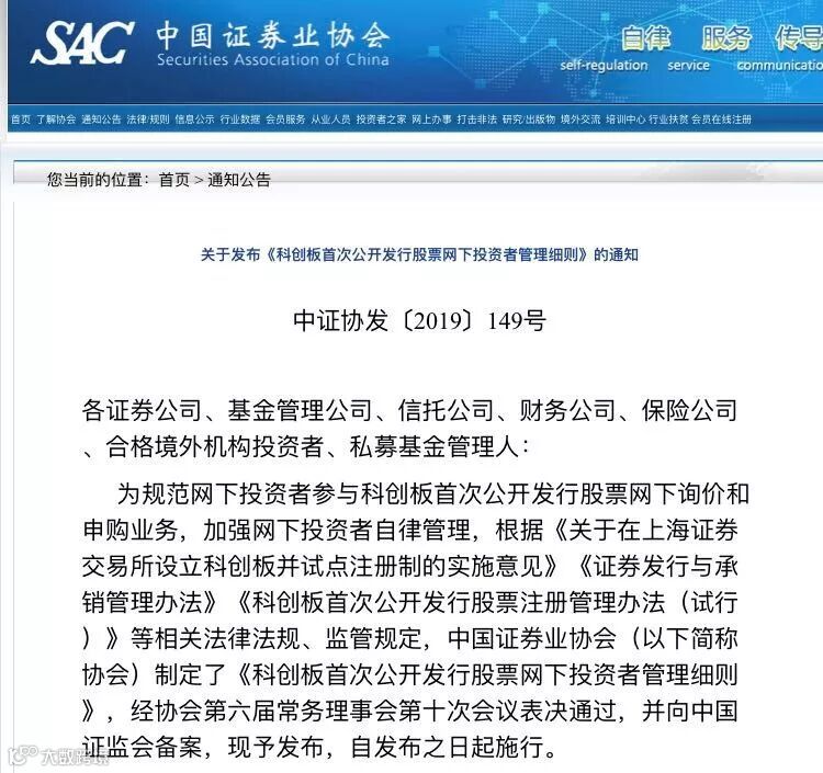 5月31日,中国证券业协会发布了《科创板首次公开发行股票网下投资者管理细则》(简称《管理细则》),共22条,对网下投资者参与科创板IPO网下询价和申购业务作出规范,强化了科创板网下投资者的自律管理。