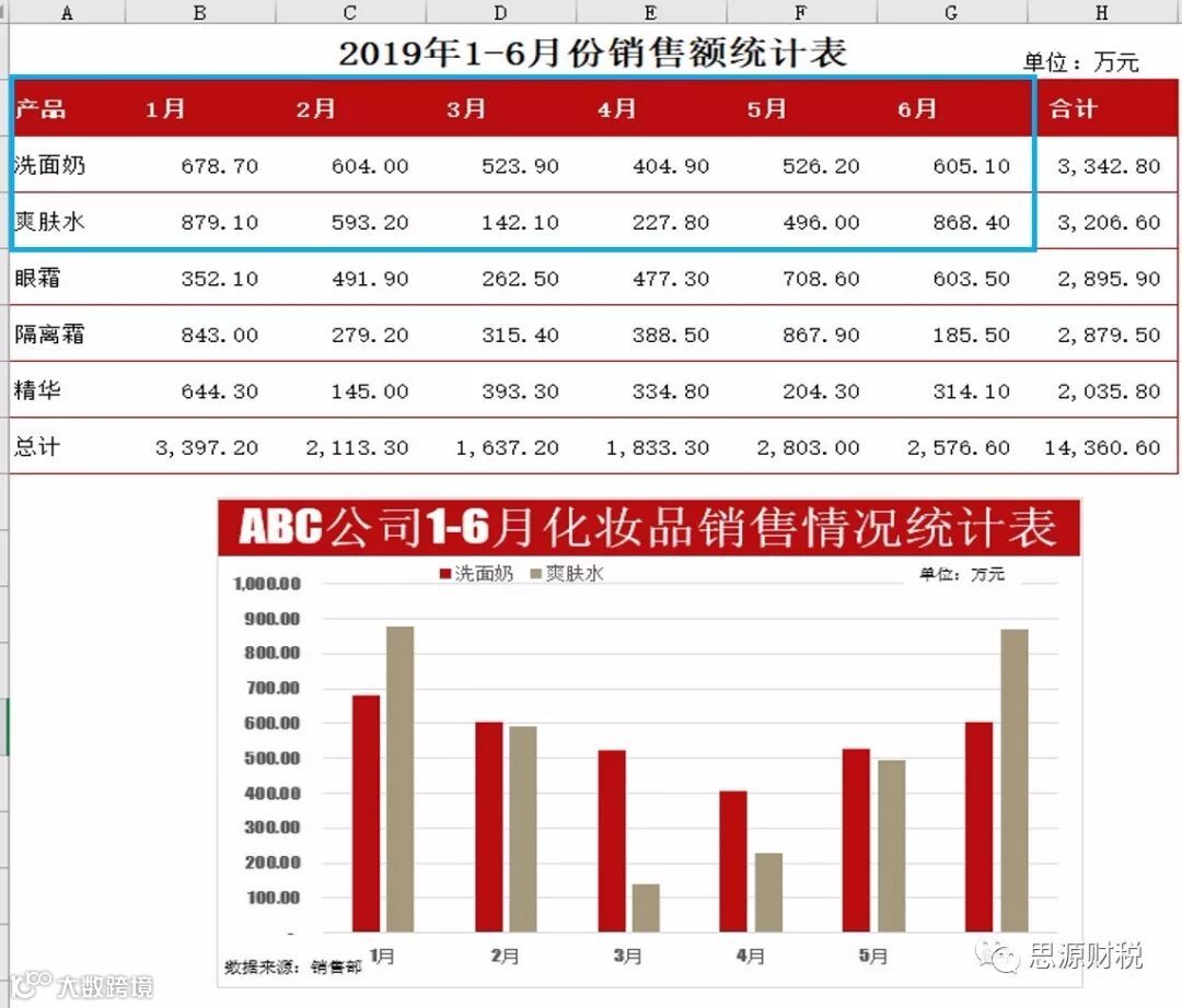 数据源:1-6月份各产品销售额统计表