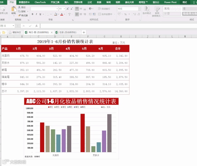 第一步:假设我们已经制作好了1-6月份洗面奶和爽肤水的柱形图,选中图表,工具栏-设计数据-切换行/列,如图1-1;