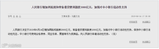 6月14日A股收市之后,央行宣布:增加再贴现和常备借贷便利额度3000亿元,加强对中小银行流动性支持,保持中小银行流动性充足。中小银行可使用合格债券、同业存单、票据等作为质押品,向人民银行申请流动性支持。