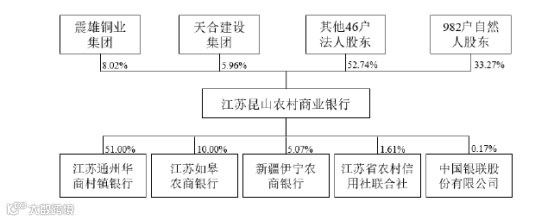 昆山农商行IPO预计发行股数上限是5.39亿股,我们以一张图快速说明其股权结构:
