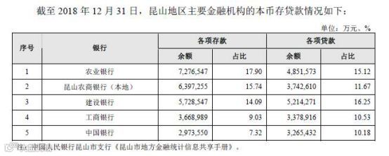 截至2018 年末,昆山农商行存款余额(剔除异地支行)占昆山市场总额的15.74%,在昆山市金融机构中排名第2 位,仅次于农行;贷款余额占比为11.67%,在昆山市金融机构中排名第3 位,次于建行和农行。