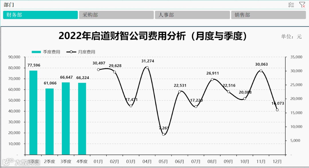 如果只是做这样的费用静态图表,那后续要财务分析,按照部门分析,应该怎么办?难道需要重新再去做重复的工作吗?这对于财务人员来说太痛苦了,我们如何能够做出一个动态的图片,适用于不同部门的费用分析?