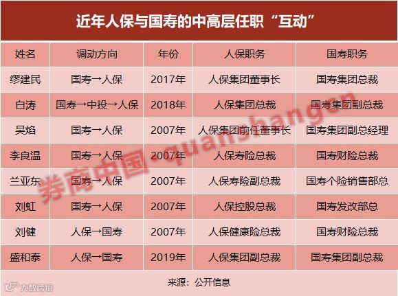 而从近年公开信息看,人保集团和国寿集团这两家保险巨头之间的高管流向,主要是从国寿集团到人保集团。