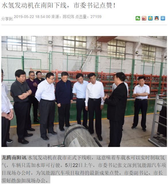 昨日一则题为《水氢发动机在南阳下线,市委书记点赞!》的新闻在网络发酵。据南阳日报网站报道,水氢发动机在该市正式下线,这意味着车载水可以实时制取氢气,车辆只需加水即可行驶。5月22日上午,市委书记张文深到氢能源汽车项目现场办公时,为氢能源汽车项目取得的最新成果点赞。