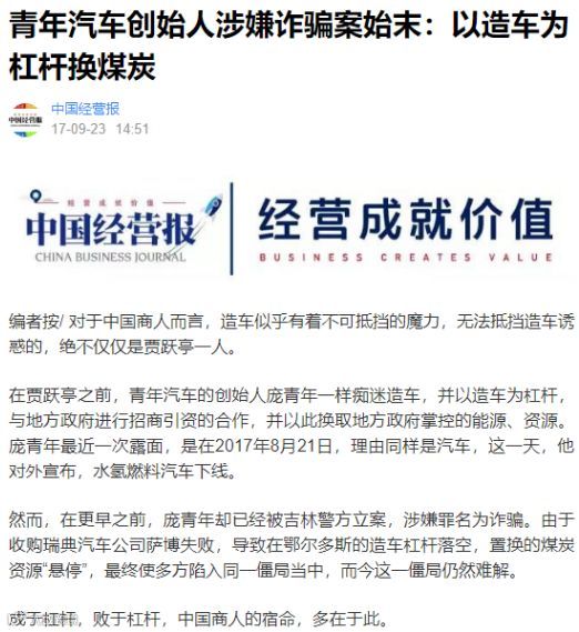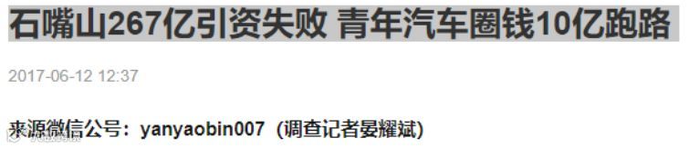 2017年6月12日,搜狐网刊登《石嘴山267亿引资失败 青年汽车圈钱10亿跑路》,文中写到,对于石嘴山来说,和全国诸多地方一样,引进浙江青年汽车集团有限公司(下称浙江青年汽车)成为一场噩梦,圈地圈资源走人,再次在石嘴山上演。5月11日,大批被浙江青年汽车骗走10多亿元的民众聚集在石嘴山市信访局,而这样反映情况的已经长达多年,且并不局限在石嘴山范围内。