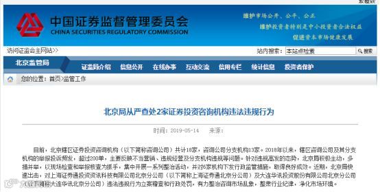 5月14日,北京证监局在官网表示,针对违规高发的态势,北京证监局积极主动,多措并举,以现场检查和举报核查为抓手,集中开展一系列整治活动,从严查处2家证券投资咨询机构(下简称“咨询公司”)违法违规行为,并对6家机构下发行政监管措施,取得良好成效。