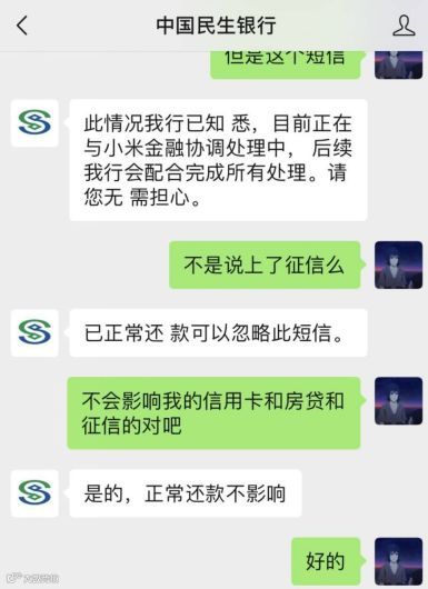 民生银行客服则表示,如果已正常还款,可以忽略短信,但因为已经有多个小米金融用户反应此问题,目前已经与小米金融协调处理中,后续该行将配合完成所有处理。