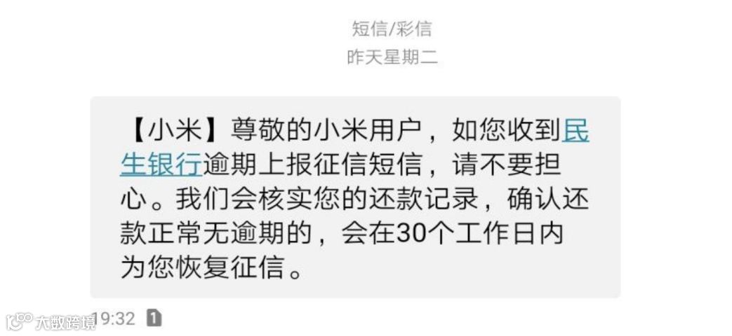 5月15日,部分小米金融的用户反馈,突然收到民生银行的短信,在小米金融正常还款下,民生银行发出了逾期警告,并告知客户将依法可纳入信征系统。