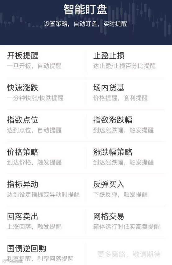 智能盯盘则提供13个盯盘策略、9个指标预警、12个行情异动盯盘。盯盘策略的种类和数量都是行业领先,更有开板提醒、快速涨跌等行业创新的策略,投资者不用看盘,也不会错过任何机会。