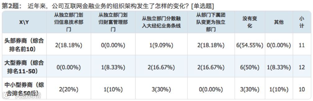 具体而言,中小型券商对网金部门的拆分最为显著。在受访的中小型券商中,除30%表示其网金业务并未发生组织变动外,其余70%均已将网金业务划归其他部门,甚至分拆至多个部门;在大型券商中,50%表示网金业务发生了调整,其中25%是将网金业务变更为独立部门,另外25%是划归财富管理或大经纪条线;而对于头部券商来说,45%表示网金业务进行了变更,其中18%成立了独立部门,18%划归信息技术部门,另有9%分散并入了大经纪业务。