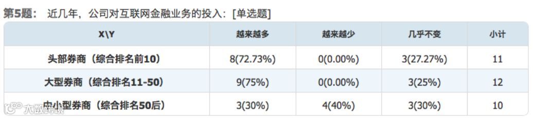 事实上,头部和大型券商对网金业务的重视程度尤甚。例如,国泰君安证券透露,公司高度重视对科技的战略性投入,2018年公司在信息技术方面投入10.51亿元,约为上一年度营收的6.08%。数据显示,在来自头部券商、大型券商的受访者中,认为公司对网金业务投入增加的,占比分别高达73%和75%,其余受访者也均表示这项投入并未受到削减。而在中小型券商中,情况却大不相同,仅有30%的受访者表示网金业务投入是增加的,另有40%的受访者表示公司对网金业务的投入正越来越少。