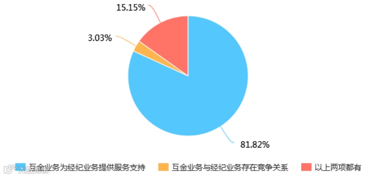 与网金被拆分对应的,有高达81.82%的受访者认为,公司对网金业务的定位就是为经纪业务提供服务支持;仅有3%的受访者认为网金业务与经纪业务存在竞争关系,15%的受访者认为网金业务与经纪业务既有竞争关系也有支持关系。
