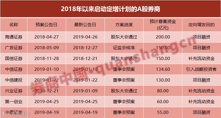 除了配股,去年以来,包括海通、广发、国信、中信建投、兴业证券、第一创业、中原证券等7家券商都启动了定增事项。